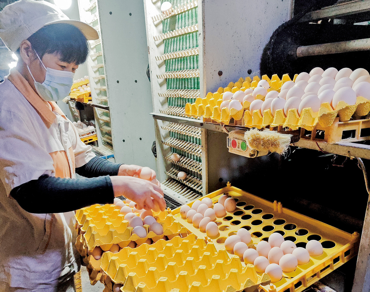 ▲房天梅在蛋雞養殖場內的集蛋器前認真地分揀雞蛋。