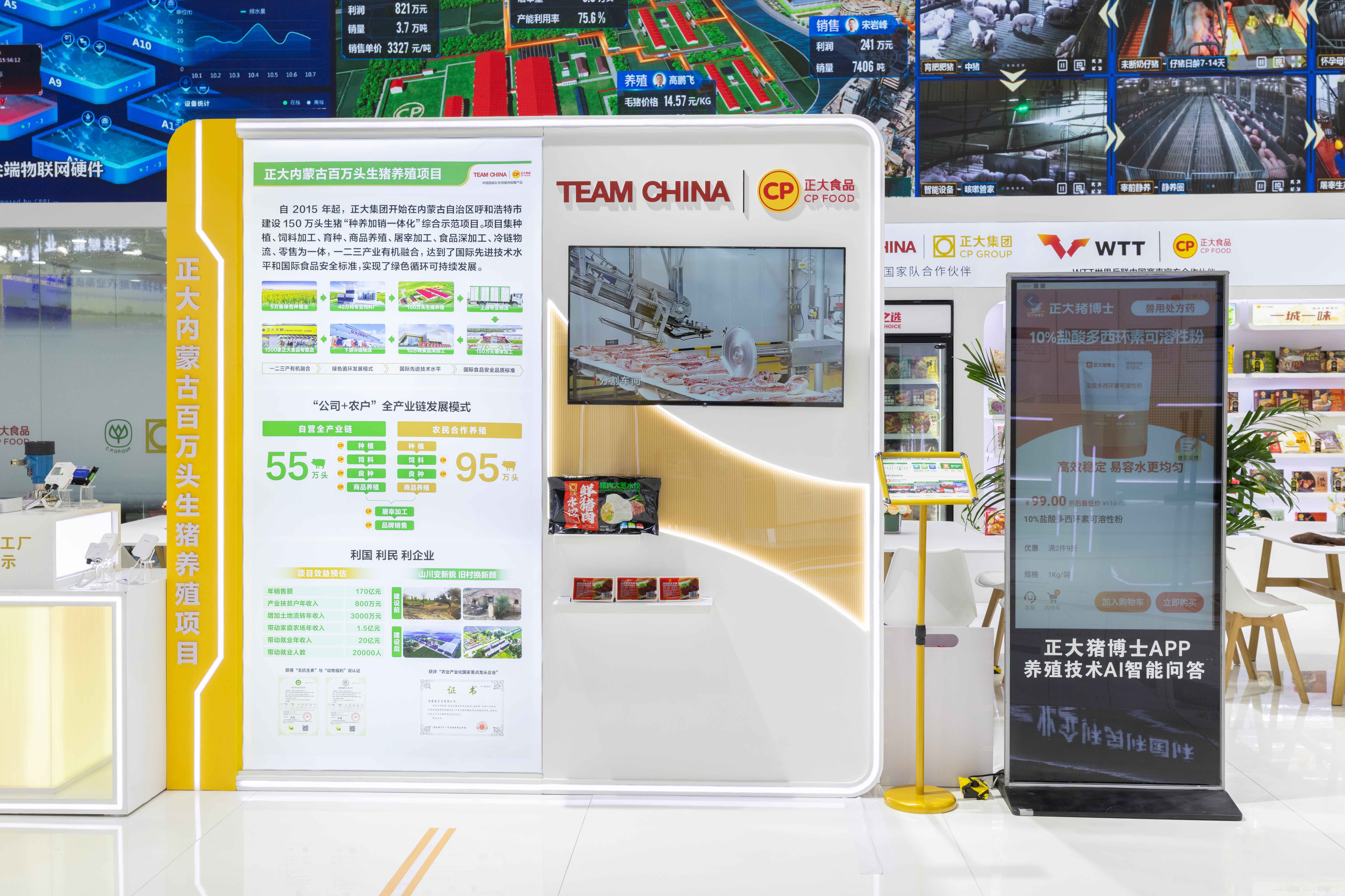 正大展館中央的智慧大屏呈現正大集團核心中樞——“數字戰房”數據中心的強大功能。觀眾可直觀看到全產業鏈各環節的運行畫面與數據流,實現從源頭到終端的精準監控與管理。重點展示了利用IoT設備對養殖場環境、健康指標的監測,實現科學養殖決策。